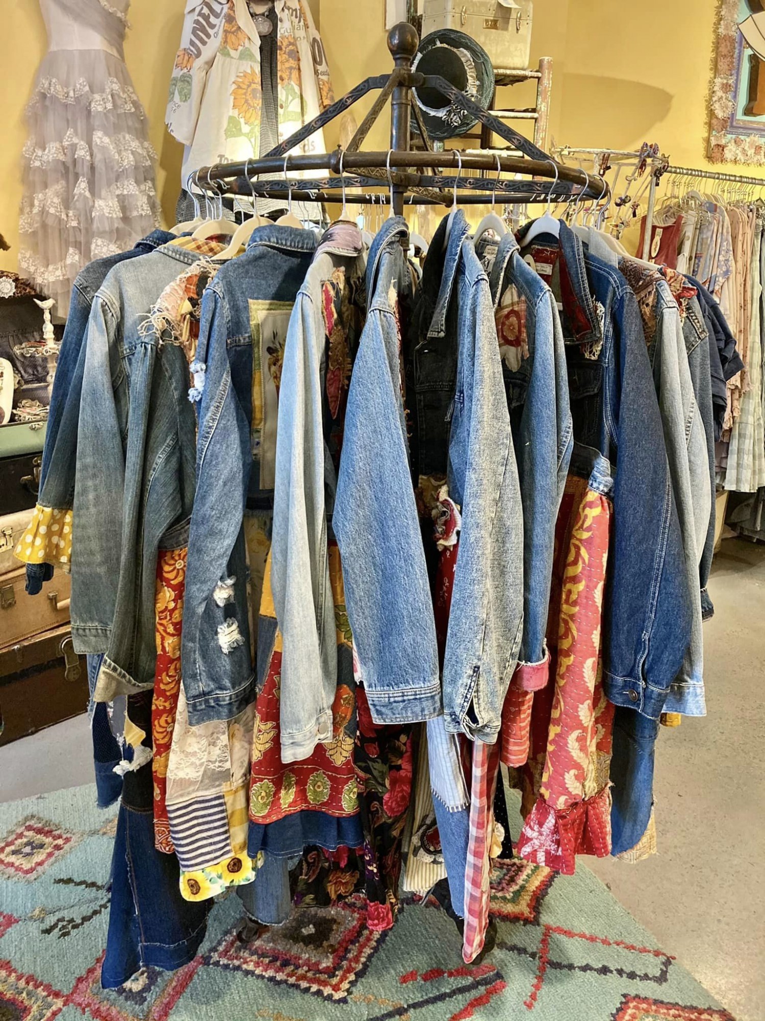 Across the street at Gypsy Palooza, you will also find upcycled fashion designed and created by Anna VanLuven. I love her style and I get tons of compliments each time I wear my jacket created by Anna.